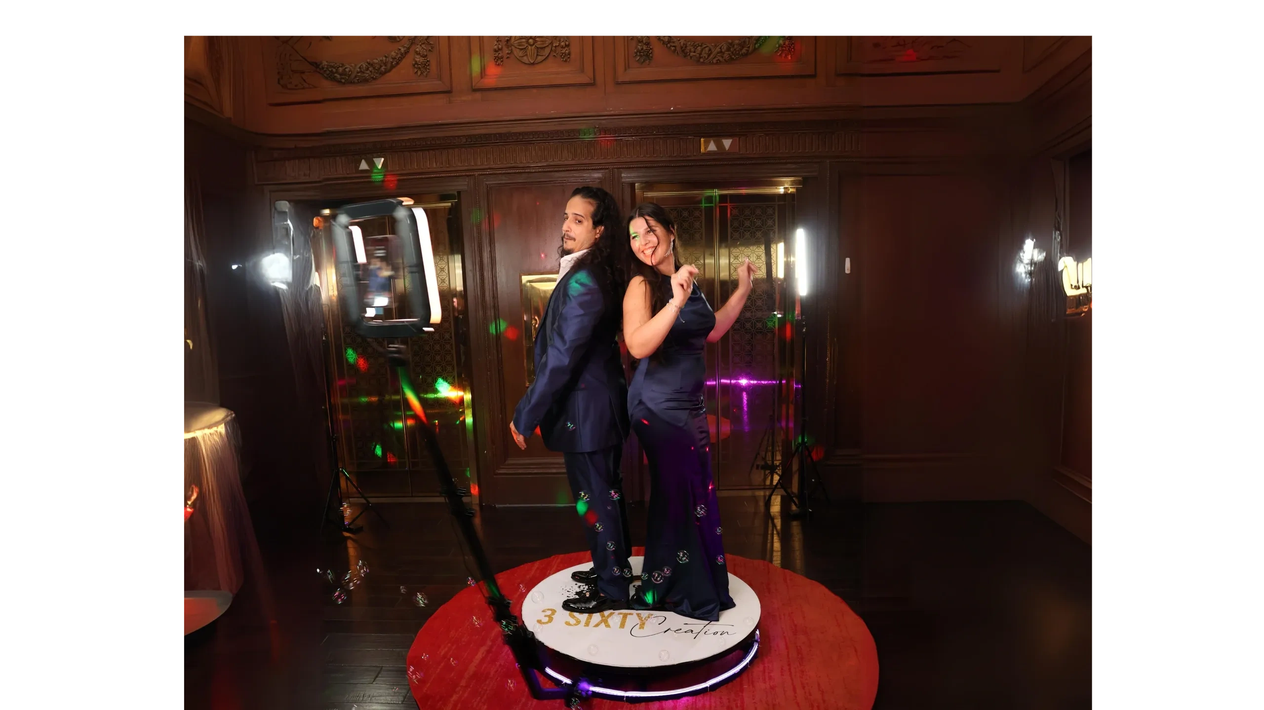 The 360 Booth takes videos of guests through a camera mounted on an arm that rotates around the platform that guest will be standing on. The arm rotates 360 around the guest to catch every pose on a slow motion video clip.